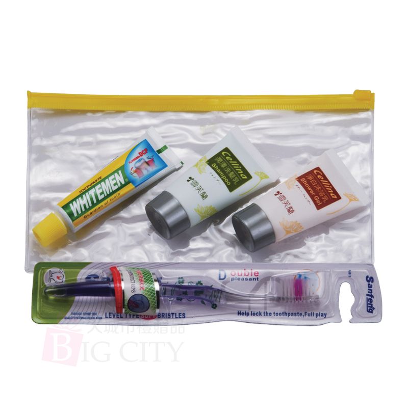 配件:PVC袋+30G白人牙膏+雪芙蘭沐浴乳+洗乳髮+柔毛牙刷