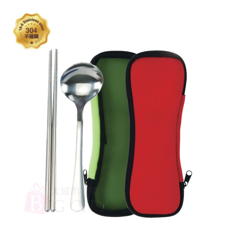 尺寸:材質:潛水透氣網布包+304餐具 內容物:19cm筷+湯匙 布包色:紅.綠.藍 *裸裝出貨,包袋另議